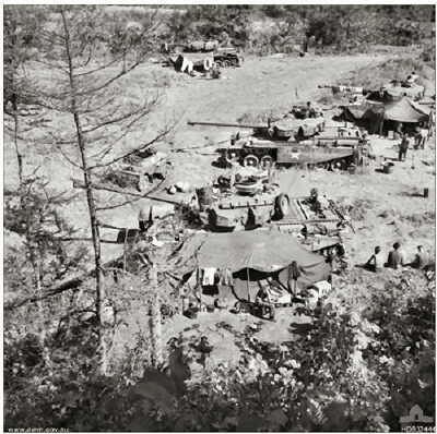 B A T T L E F I E L D K O R E A  Korea c. 1951. Their job of supporting the Australians in their push against the Chinese in Korea finished for the time being, a troop of B Squadron, 8th King's Royal Irish Hussars, takes a well-earned break. (AWM HOBJ2444)