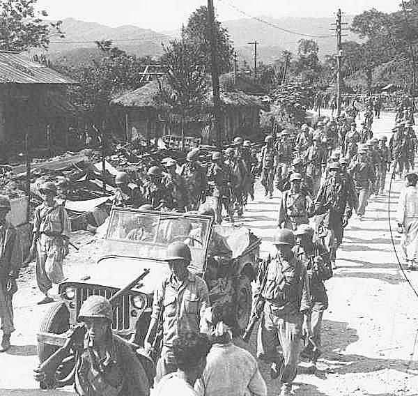 These lightly armed troops, carrying cartridge belts with canteens but no packs, are moving to locate and engage enemy forces which they assume are not in strength. Like our 24th Infantry in the Pusan Perimeter, the North Koreans had fled after being crushed at Inchon and Seoul, throwing away their weapons as they ran, and the opportunity to unify Korea was too much temptation for South Korean leaders, and shortly for UN command as well..