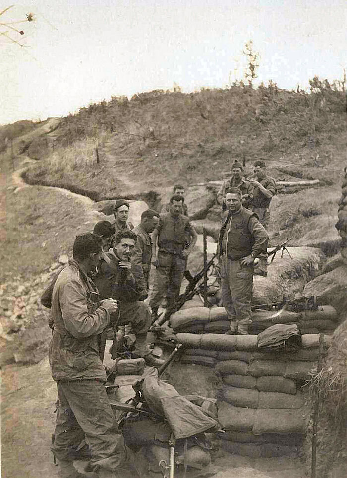 Note the majority of weapons are semi-automatic Brens or Owens. Allmembers of the patrol will wear flak-jackets, they were very protectiveagainst grenade shrapnel. Soldier at front left appears to have a rifleand is carrying spare magazines for a bren gun in his pocket. A ratherferocious bayonet is laying on the sandbags, they fitted both .303 rifleand Owen guns. The trench line cut through the hillside is for protection and movement,if being shelled or mortared. Not too wide as can be seen, thus harder todrop a projectile into. By the look of the CSM standing there, and the palatial sandbag structure.This most likely was company HQ. The CSM didn't go out on these patrols,but liked to dress up and be photographed with the lads. |